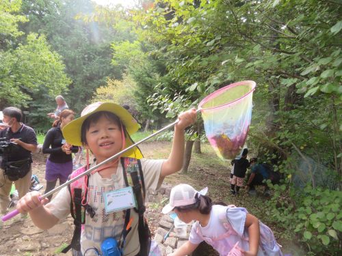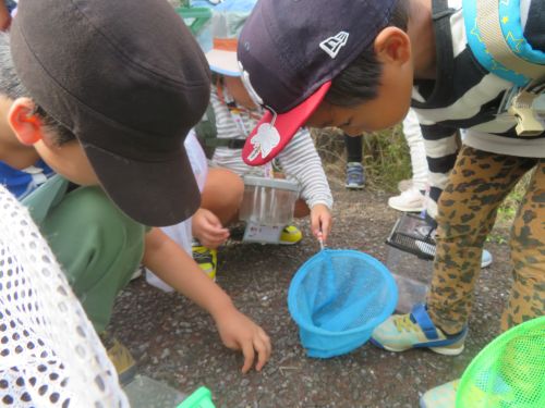 バッタは、茶色や緑色、大きいものや小さいものなど様々な種類がいて、みんな捕まえようと夢中になっていました。捕まえて一緒に観察しながら進みました。