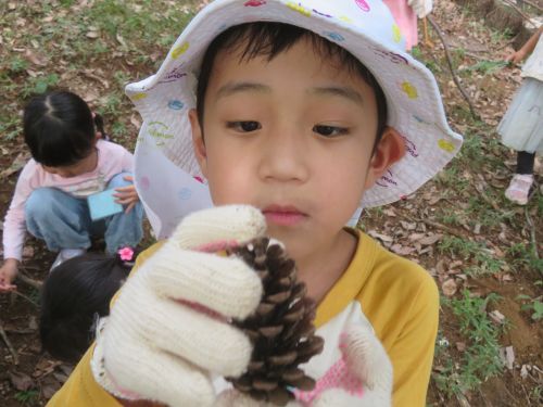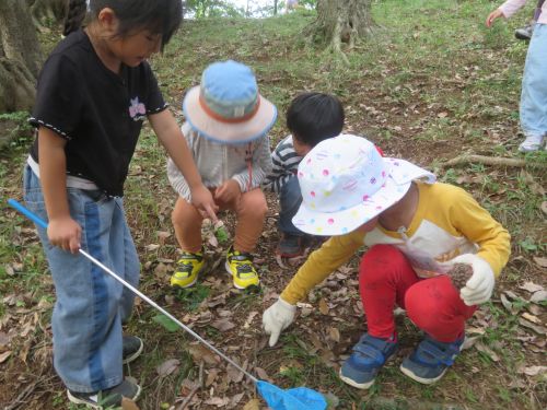 丘に到着し、思い思いにあそびがスタート!どんぐりや栗など、木の実をたくさん集めたり、大きなミミズを見つけたり…前回作った、木の枝で作った家を補強したり、様々な遊びを楽しんでいました。おやつの時間は、広場に移動しました。