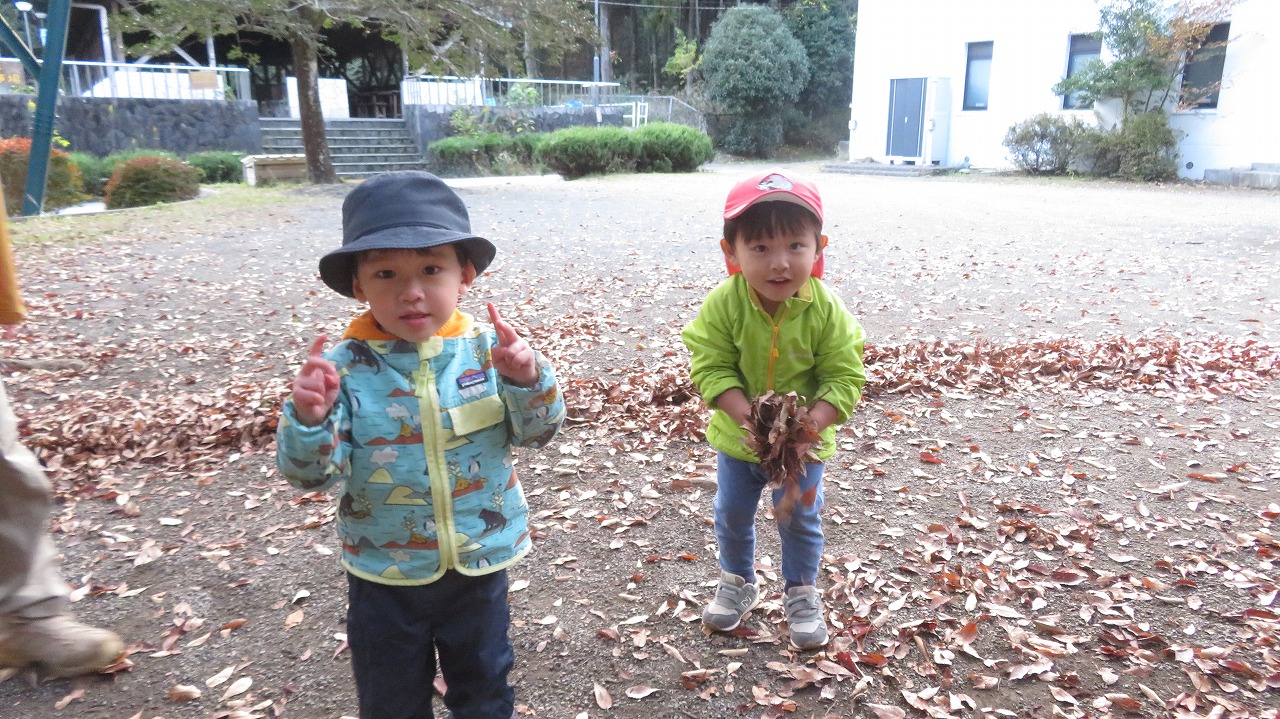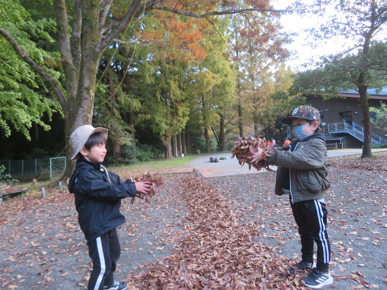 どんぐりや黄色の葉っぱなど、秋らしい景色の中活動を行いました。