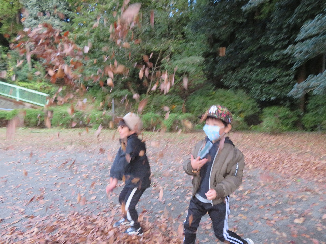 家づくりや虫探しに没頭していると、気づけばおやつタイム!広場へ移動しました。おやつを食べて、もう一息あそびの時間。大きな欅の落ち葉がたくさんあり、集めては飛ばしている子、スタッフ探しゲームをしたりして過ごしました。