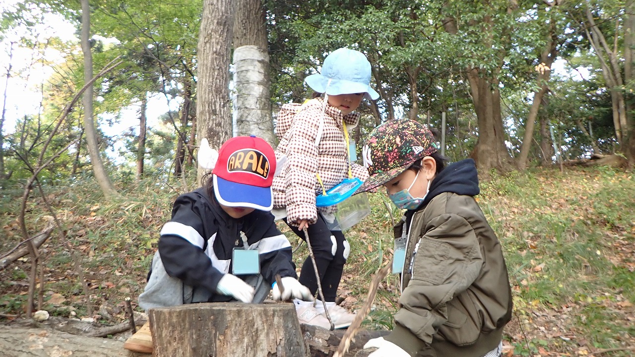 木の枝を集めて立てかけたり、大きな木の穴を枝で削ってみたり、家づくりを中心とした遊びが展開されました。家づくりではなく、虫探しに夢中な子や、秘密の場所を教えてくれる子もいました。