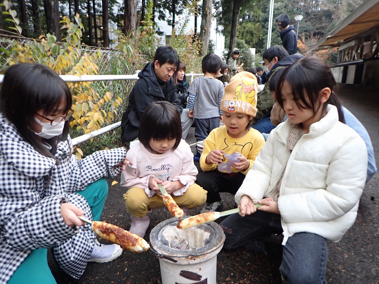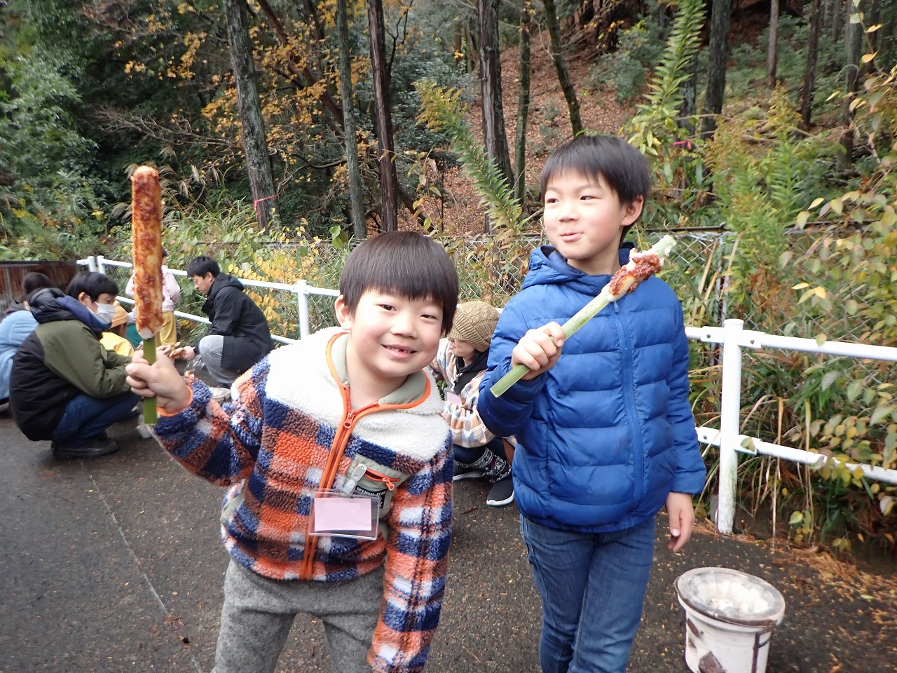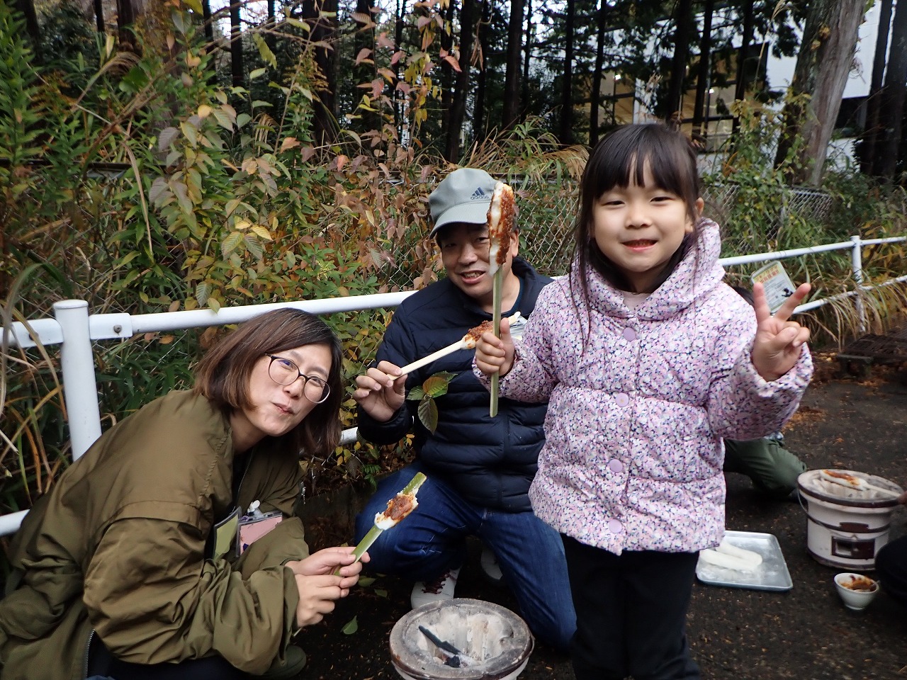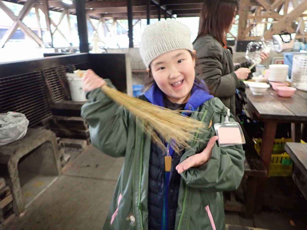 ご飯も豚汁もとても美味しく、完売していました!昼食後は、稲わらのミニほうきづくり、竹の名前入りキーホルダーやお米のできるまでの展示を見たり、家族ごとに炊いたご飯で作った五平餅を味わいました!