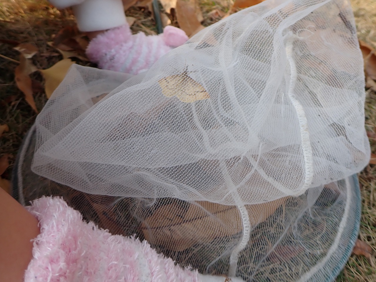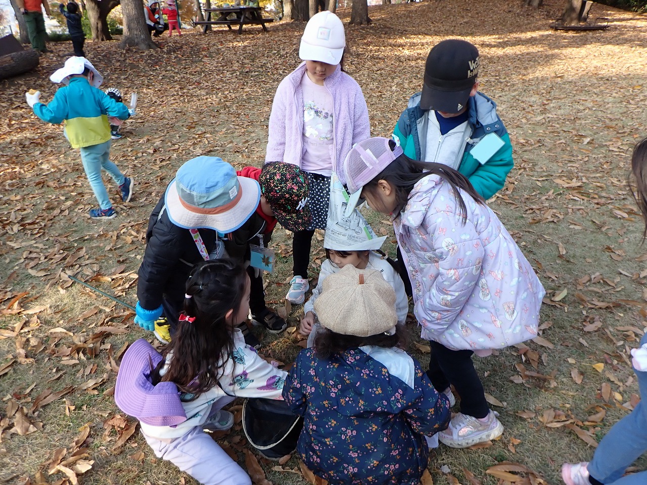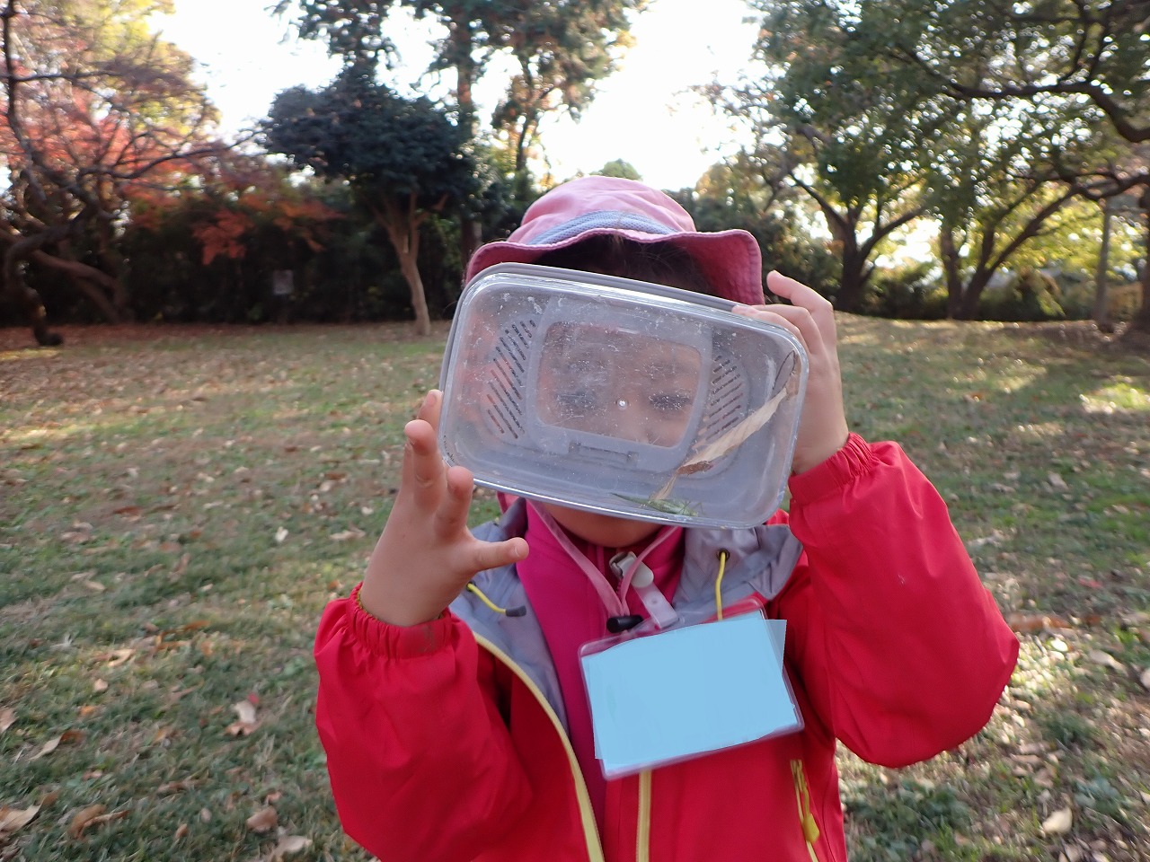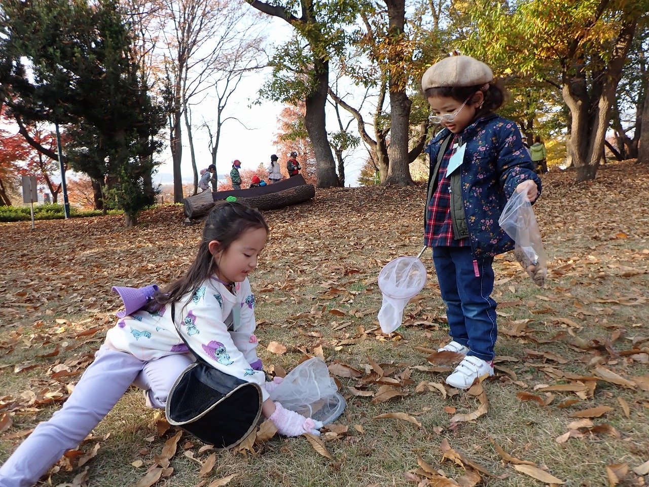 虫たちは冬ごもりかと思っていると…「ちょうちょつかまえたー!!」との声が!ちいさな蝶のような生き物をつかまえていました。みんなでしばらく観察していました。また、ばったや小さなてんとう虫に似た虫も見つけて、見せてあげたり、虫かごに入れてあげていました。