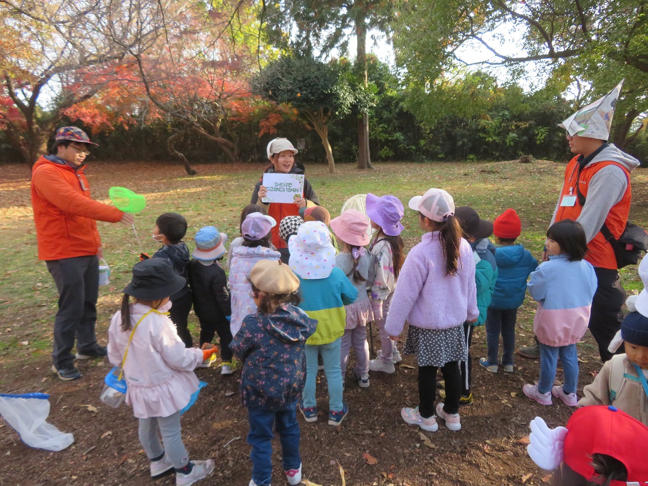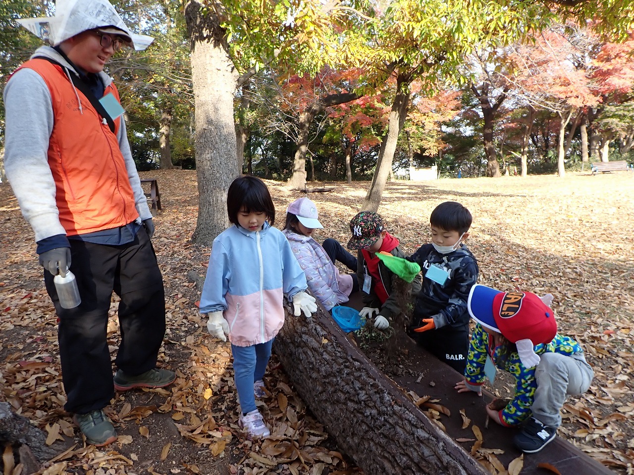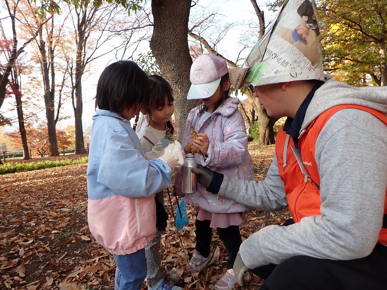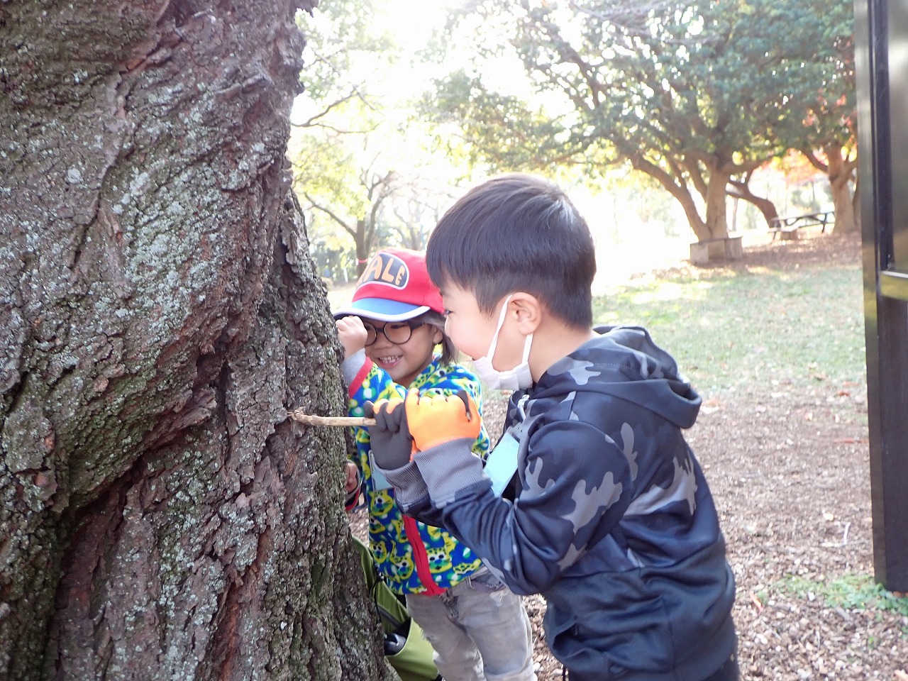 虫たちは冬ごもりかと思っていると…「ちょうちょつかまえたー!!」との声が!ちいさな蝶のような生き物をつかまえていました。みんなでしばらく観察していました。また、ばったや小さなてんとう虫に似た虫も見つけて、見せてあげたり、虫かごに入れてあげていました。