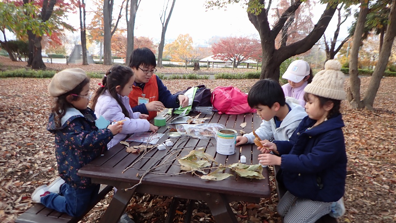 こちらは、色とりどりの落ち葉を型抜きして遊んでいました。型抜きした落ち葉を、「1枚100円で~す!」とお店屋さんをしている子もいました。