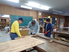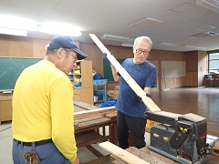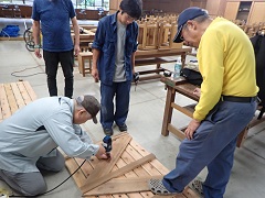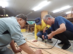 雨が降ると、宿泊棟B、C棟の階段下に大きな水たまりができてしまうため、水たまりを踏んでびしょびしょにならないために、階段下に敷くすのこを作りました。