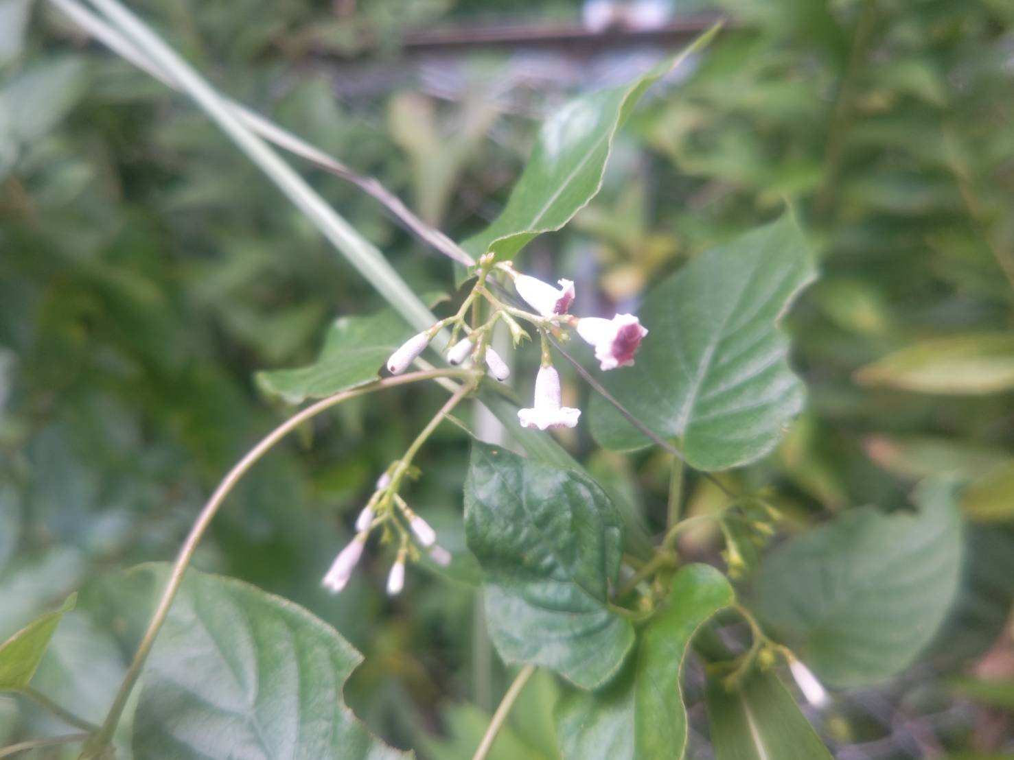 鮮やかな紅白の花とハート型の葉を持つかわいらしいツル植物。でも名前は「ヘクソカズラ」。区切るとしたら「へ・クソ・カズラ」。香りが名前の由来になっています。英名は「Skunk vine(スカンクのツル)」。