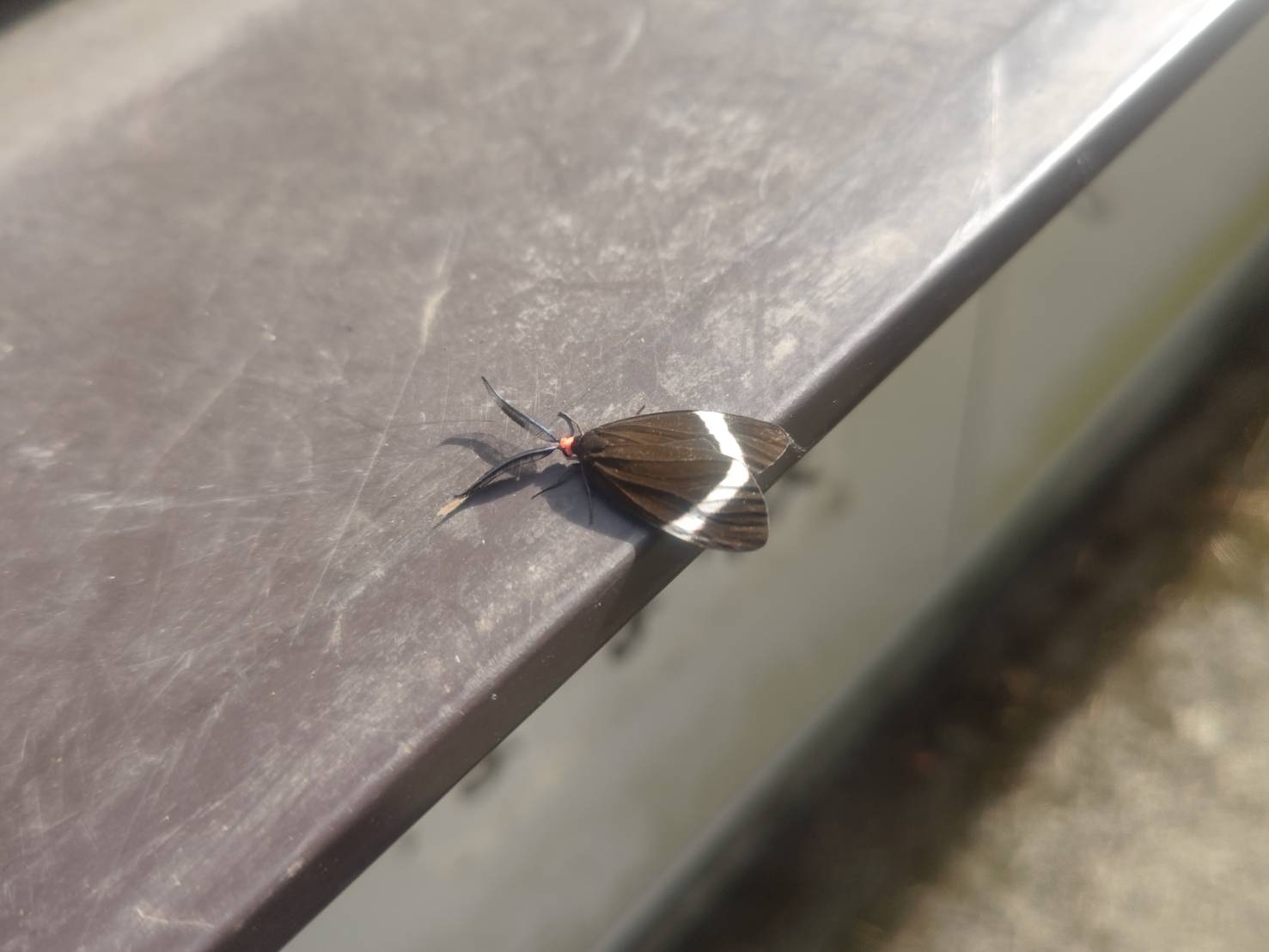 鮮やかな赤い頭と白線の入った黒い羽のホタルガでした。チョウ…ではなくガでした。センター内で見たのは初めてかもしれません。幼虫も見たことがないです。どこか離れたところから迷い込んできたのでしょうか。