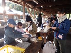 最初に薪割りをして、ひき肉、つなぎ、すりおろしたレンコンを袋に入れて、皆さんにこねてもらいました。