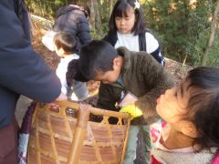 各班ひとつずつ背負子を背負って、かごがパンパンになるまで杉の葉や乾燥した枝を集めました。