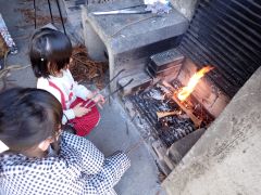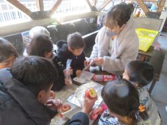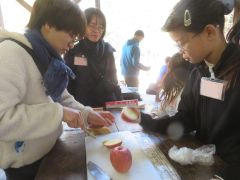 どの班もおいしく煮込みハンバーグができたところで、午後は焼きリンゴづくりです。