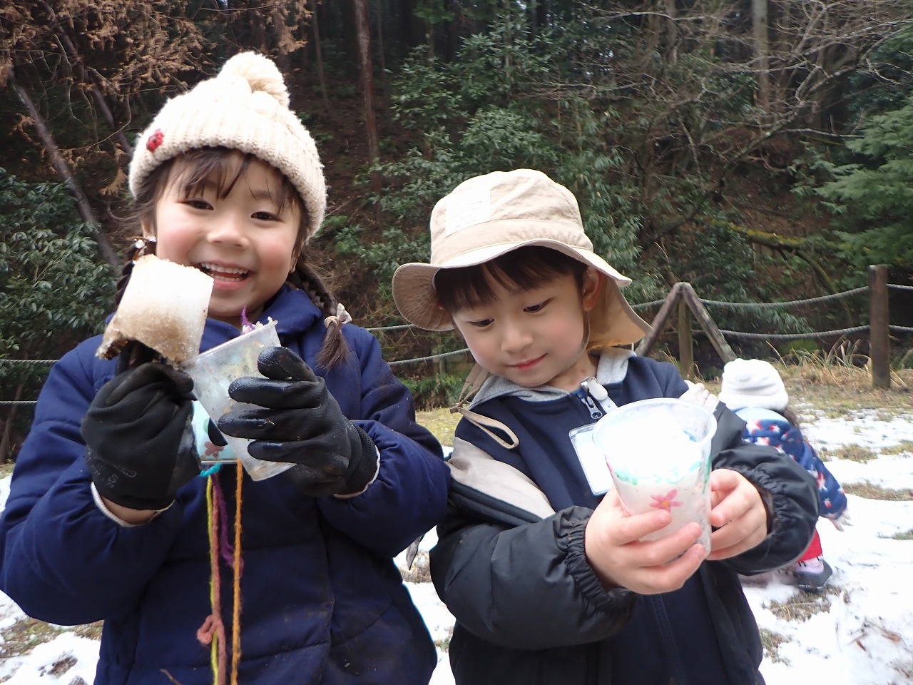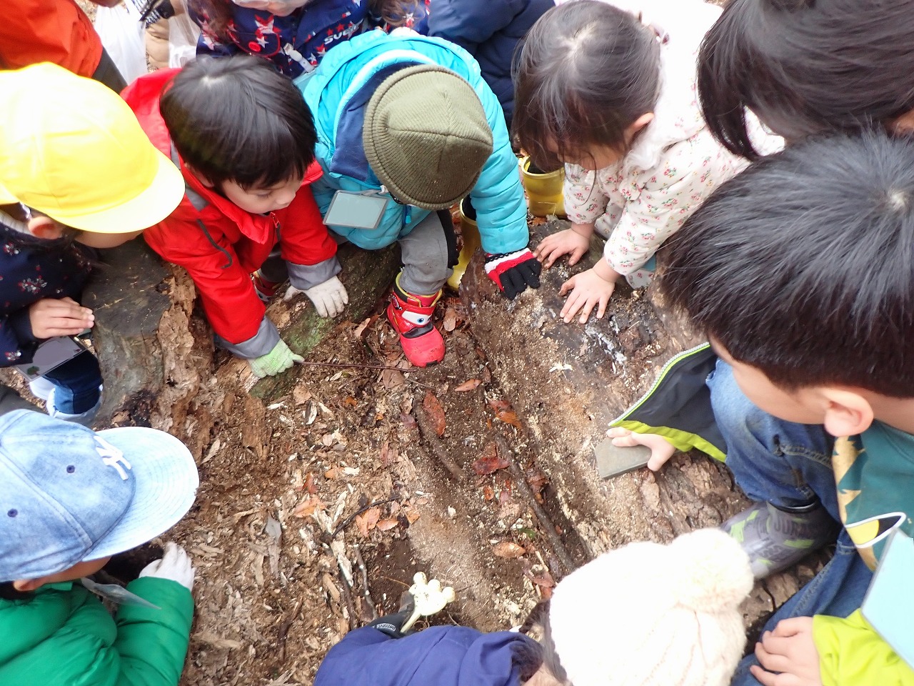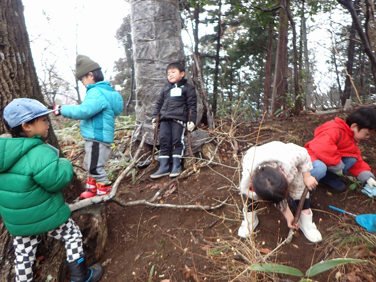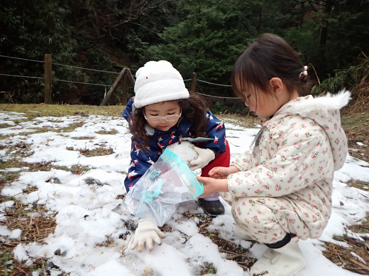 まずは山あそび!毎回少しずつ進化している家づくり。新たな家も作り始めました!冬ですが、生き物もはっけん!「カブトムシの幼虫がいたよー!!」「ミミズもいたよー!!」という声が…