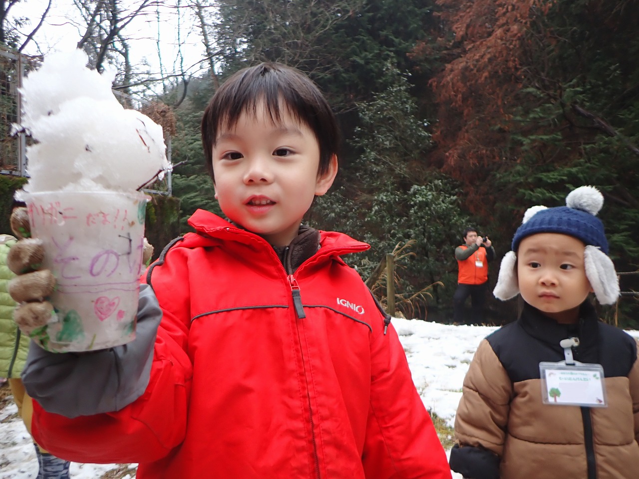 入らずにはいられません。どんな感じなのか、入ってみました。上「雨降らせるよ~!」と、とても上手に水を飛ばしている子もいました。いよいよ雪です!到着すると、大きな雪玉をとても上手に作っていたり、カップに詰めて「アイスクリームで~す!!」と見せてくれました!