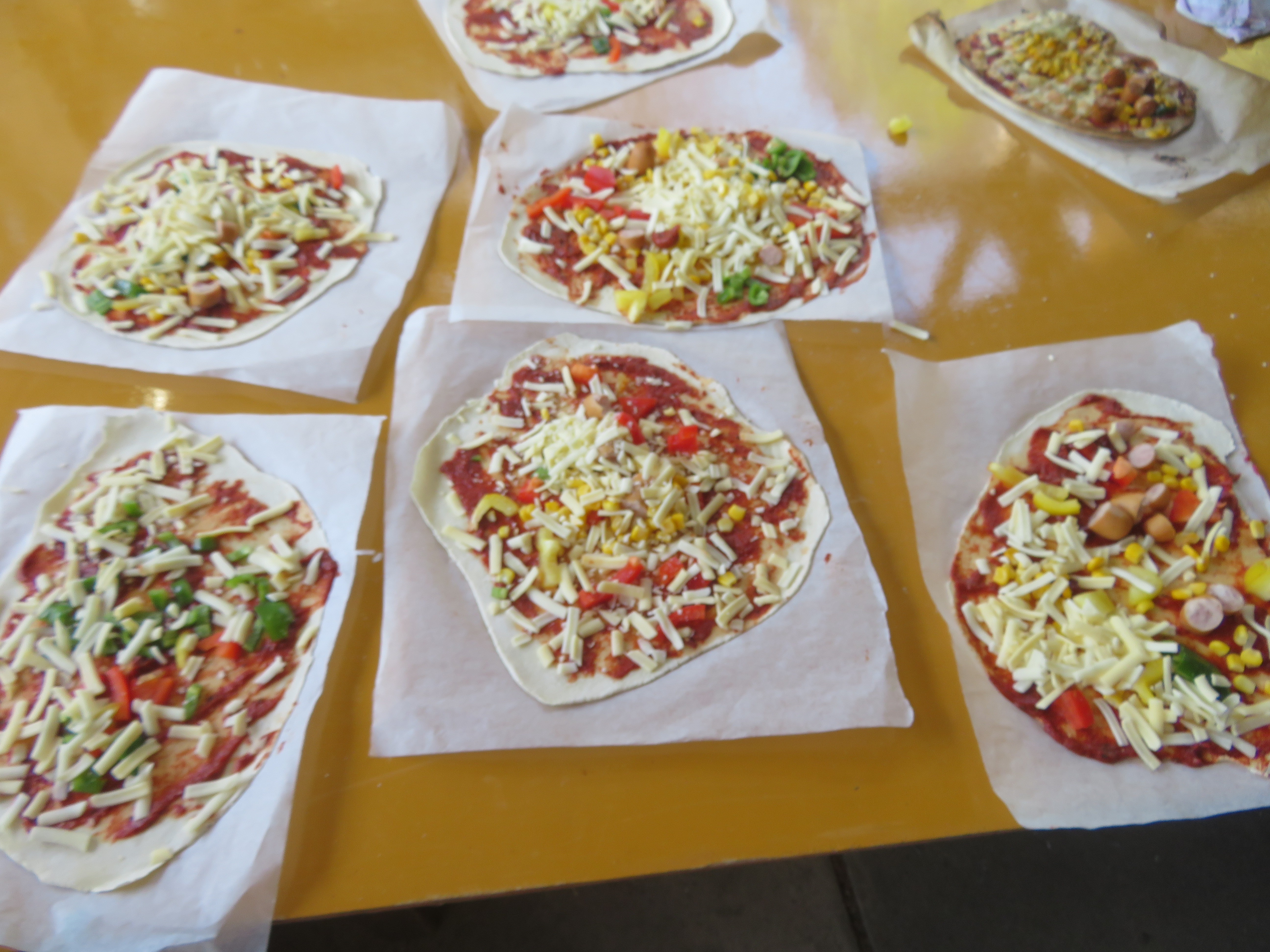 朝ご飯を食べ、みんなでお部屋の片づけをして、お昼はピザづくりをしました。