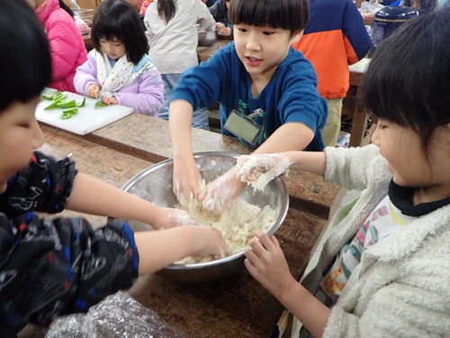班で協力しながら楽しそうにピザ生地をこねていました。