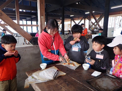 ピザの準備ができたらみんなで野外炊事場に移動して焼きながら食べました。